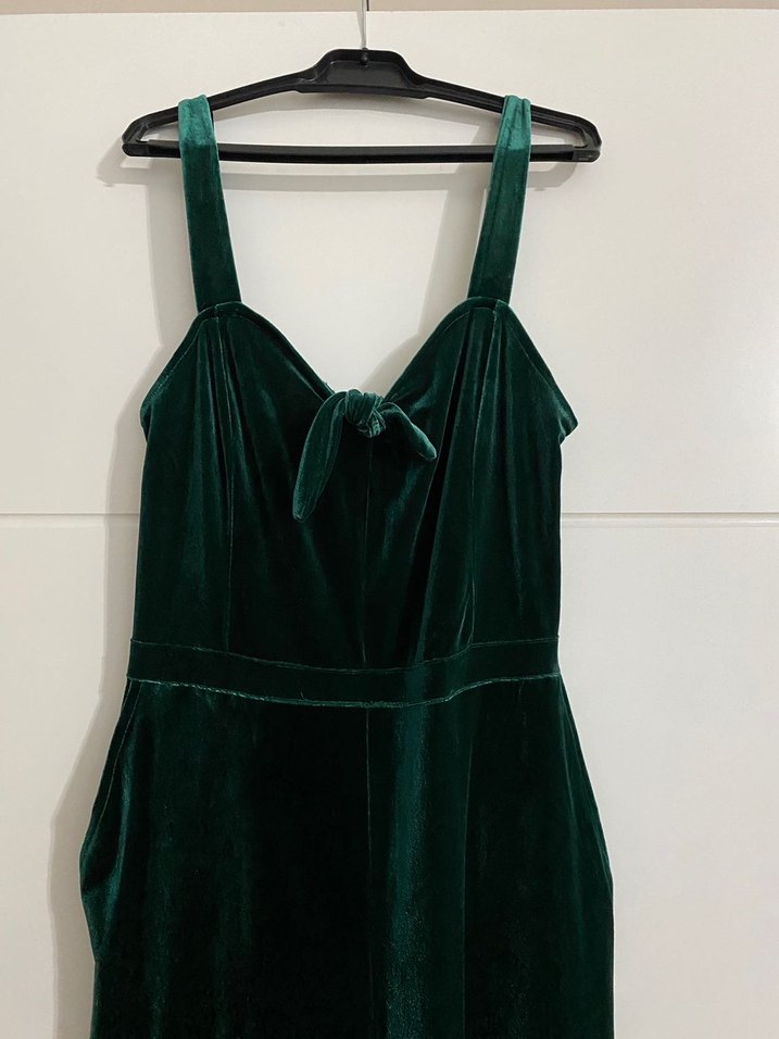 Kadın için koyu yeşil süet kumaştan tulum Boy ve ağ ölçüsü fotoğrafa eklenmiştir
