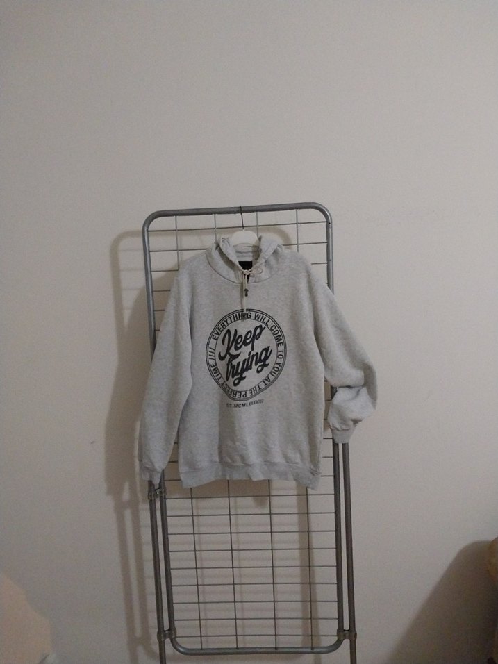 Gri renk, uzun kollu, rahat kesim sweatshirt. Baskılı ve örgü detaylı, yumuşak ve sıcak kumaştan üretilmiştir.... NOT KUSURU YOK. S.M BEDEN.