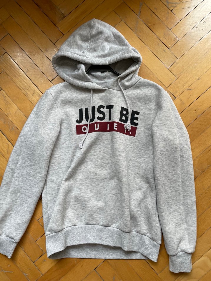 Gri renk, kapüşonlu ve uzun kollu kadın sweatshirtü, baskılı "JUST BE QUIET" deseni ve tokalı detaylarla rahat kesimde, yumuşak kumaştan üretilmiştir.