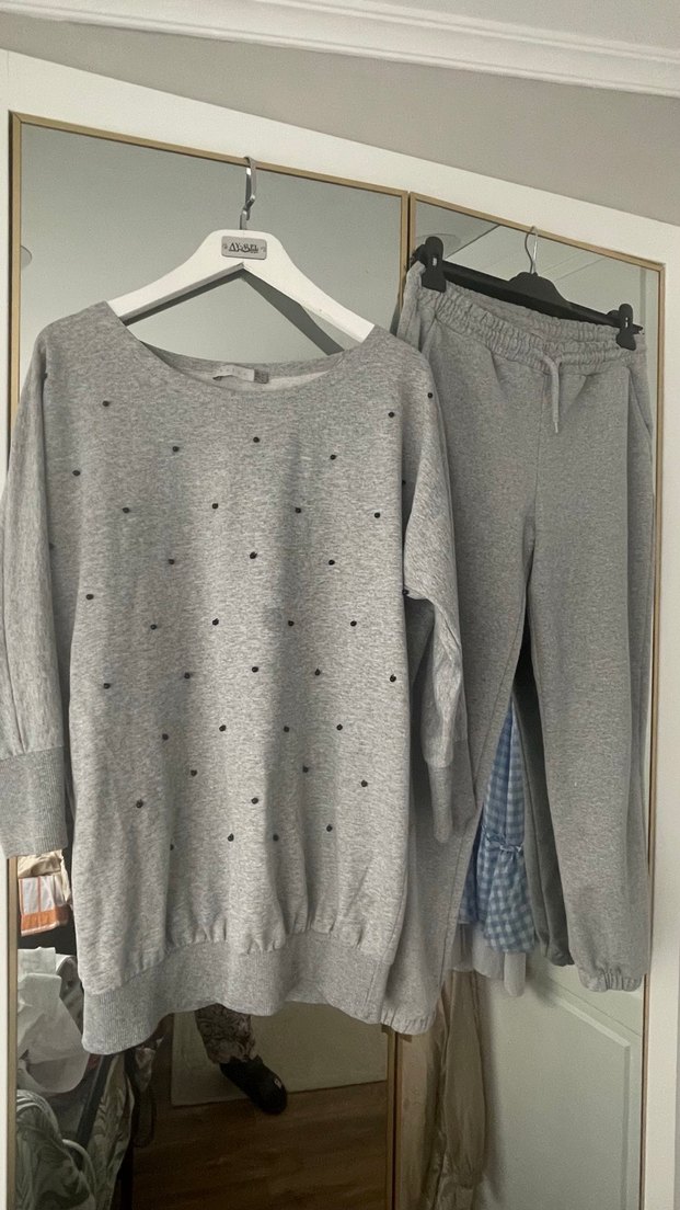 Üst uzun boy 75 kolarası 60 cm. Koton orijinal markadır Pamuklu eşofman kumaşı içi havlu gibi terletmez. Siyah boncuklu. Eksik yok. Alt lastik li cepli eşofman hediyedir ben takım yapıyorum ayrı da giyilebilir Sweat önünde minik bir leke gördüm deterjanla yıkanırsa geçer Fiata yansıtıyorum. Hayırlı olsun muhteşem bir sweathirt