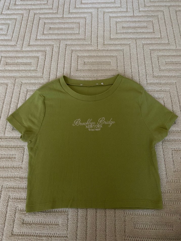 Yeşil renkli pamuklu tişört, kısa kollu ve yuvarlak yakalıdır. Baskılı deseniyle rahat ve şık bir görünüm sunar.