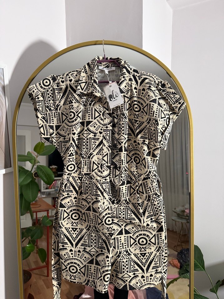 Kadın kısa tulum, bol kesim ve kısa kollu. V yaka, çok renkli baskılı dokuma kumaş ve kemerli. Bohem, retro tarzda, günlük kullanıma uygun.
