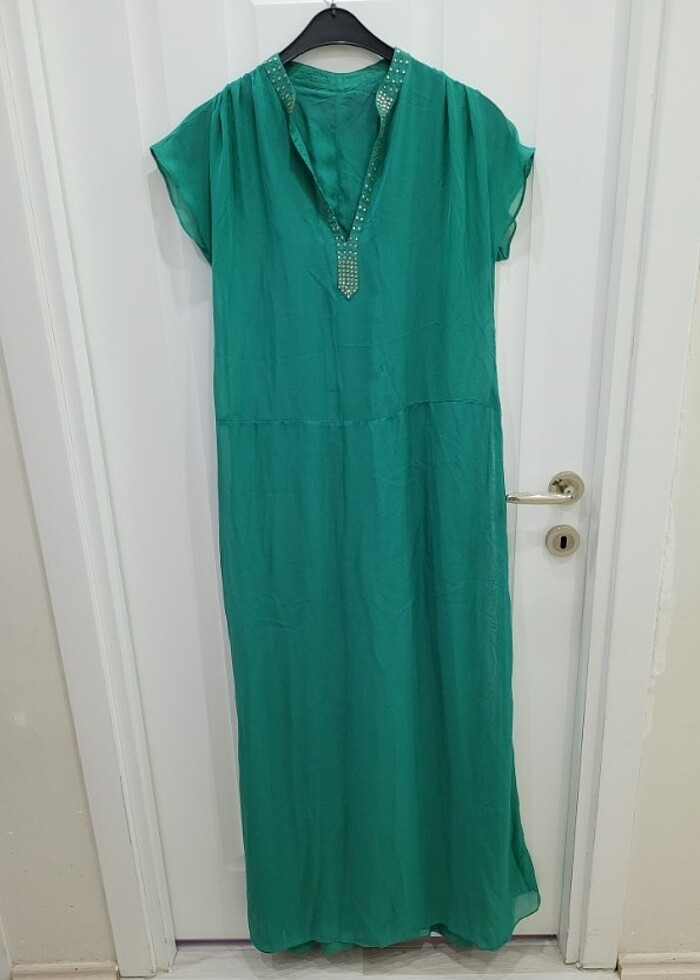 1 kere giyildi. şifon olduğu için çok hafiftir üzerinizde yok gibidir. boyu koltuk altından itibaren 1.30 .tam boy 1.55 . iki koltuk altı 48 . beli 50 cm. arkası hafif ip çekmesi var ama belli olmuyor.ben çok beğendiğim için sorun etmeyip almıştım. kotondur etiketli giysi giyemedim için üst etiketi kesmiştim.