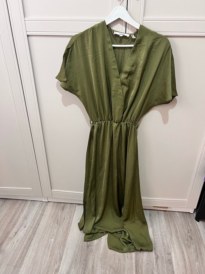 Saten kumaştan, V yakalı ve kısa kollu, salaş kesimli, parlak görünümlü haki uzun elbise. Bohem tarz için uygun, dökümlü tasarıma sahiptir. 34 beden koton marka şık elbise