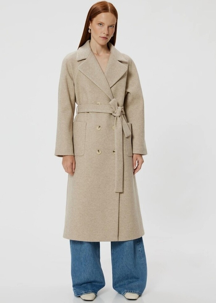 Koton Uzun Kase Kaban Kruvaze Ters Yaka Cepli Kaşe Kaban