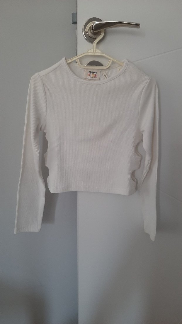 #koton uzun kollu, yanlarında pencere detaylı crop bluz. Temiz sayılı giyildi. Koltuk altına gelen kısımda minik etiketten kaynaklı delik var.
