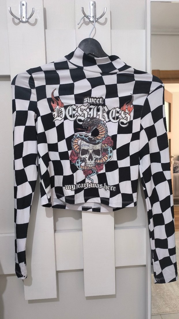Koton Dar kesim uzun kollu biker bluz, boğazlı yaka ve cesur kareli desenle. Kafatası baskısı ve tokalı detaylar içerir, sentetik kumaştan yapılmıştır. Parti için uygun koyu beyaz tonunda.