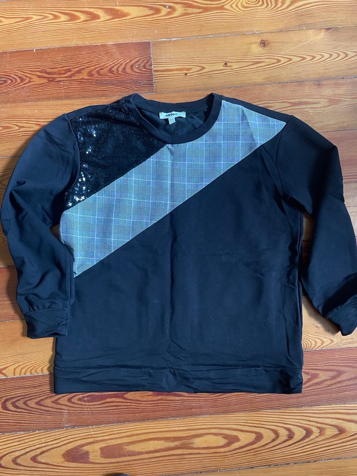 Kadın sweatshirt, uzun kollu ve bisiklet yaka ile rahat bir kesime sahiptir. Koyu renkler, gri ekose desen ve payet detayıyla şık ve günlük kullanıma uygundur. Temiz ve sorunsuzdur. Olculer en 50cm boy 60cm kol uzunlugu 50cm #koton