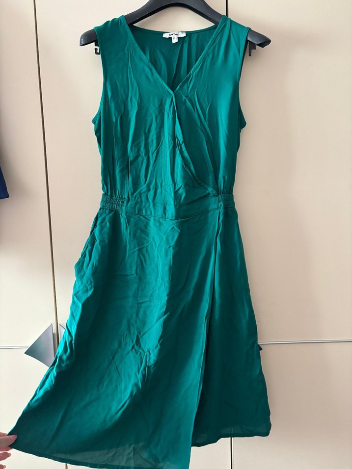 Koton marka viskon kumaştan, drapeli ve v yakalı kolsuz midi elbise. Minimalist bohem tarzı için uygun, beli lastikli, cepli, 34 beden. 1 kere giyildi.