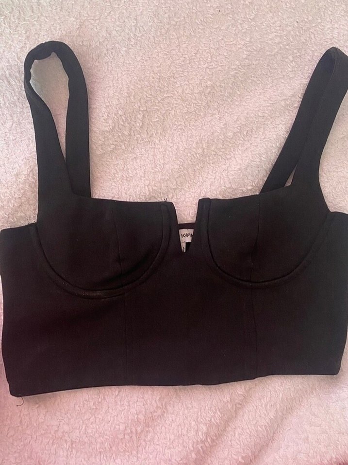 Siyah süet bustier, V yaka ve askılı, fermuarlı sırt detaylıdır. Midi boyda, minimalist goth tarzında, cesur görünümler için uygundur.