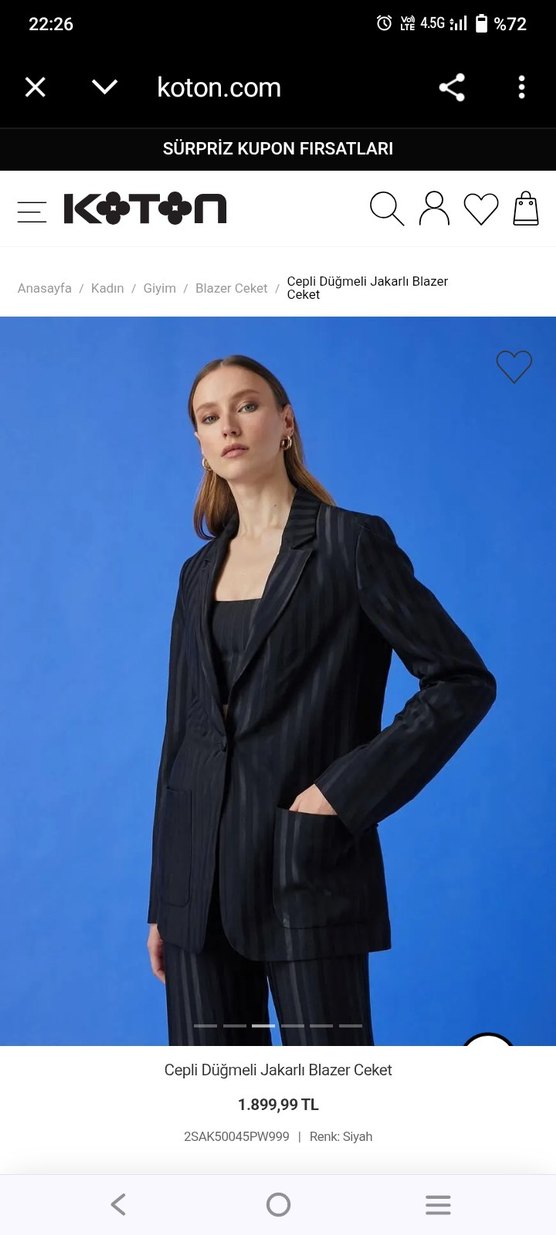 Siyah, jakarlı çizgili desenli blazer ceket, cepli ve düğmeli, uzun kollu ve regular fit. Ofis için uygun şık parça.