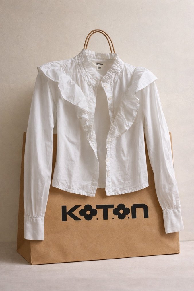 Yakalı, fırfırlı detaylara sahip beyaz keten gömlek. Uzun kollu ve normal boyda, ofis için uygun hafif renkte bir model. Cok guzel kusursuz s beden ofis sıklıgından