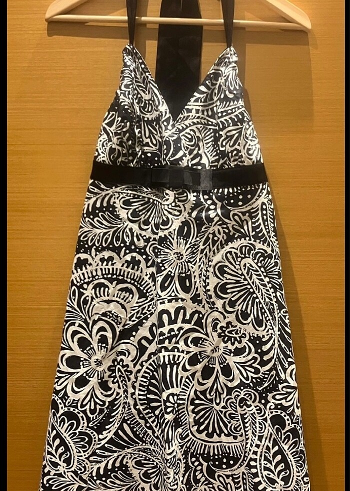 1 kez giyildi, dar geldi. 42 beden yazıyor ama 40 bedene iyi olur. Ölçüler fotoğraflarda mevcut. İnce yazlık kumaş, boyundan bağlı sırt dekolteli.