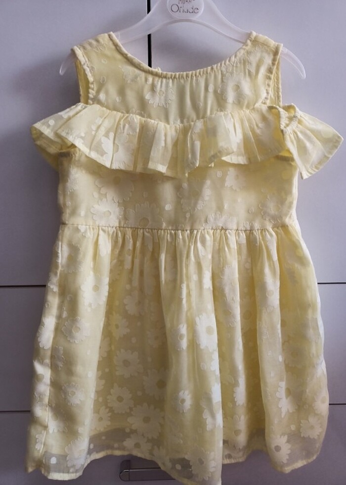 Kotonun çok güzel bi modelidir. Omuz açıl fırfır detaylı şahane rahat bi elbisedir. Çok severek kullandı kızım bi kaç defa ancak giyildi. Papatya desenlidir. Astarlıdır göründüğü gibi hiçbir sorunu yoktur. Rengi çok tatlı bi sarıdır ışıkta açık görünüyo fakat limon sarısıdır. Umarım sizde güzel günlerde giydirirsiniz