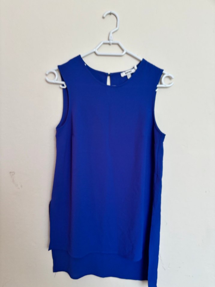 Kolsuz, yuvarlak yakalı, sentetik kumaştan yapılmış lacivert salaş bluz. Günlük ve ofis stili için uygun, drapeli tasarıma sahip.