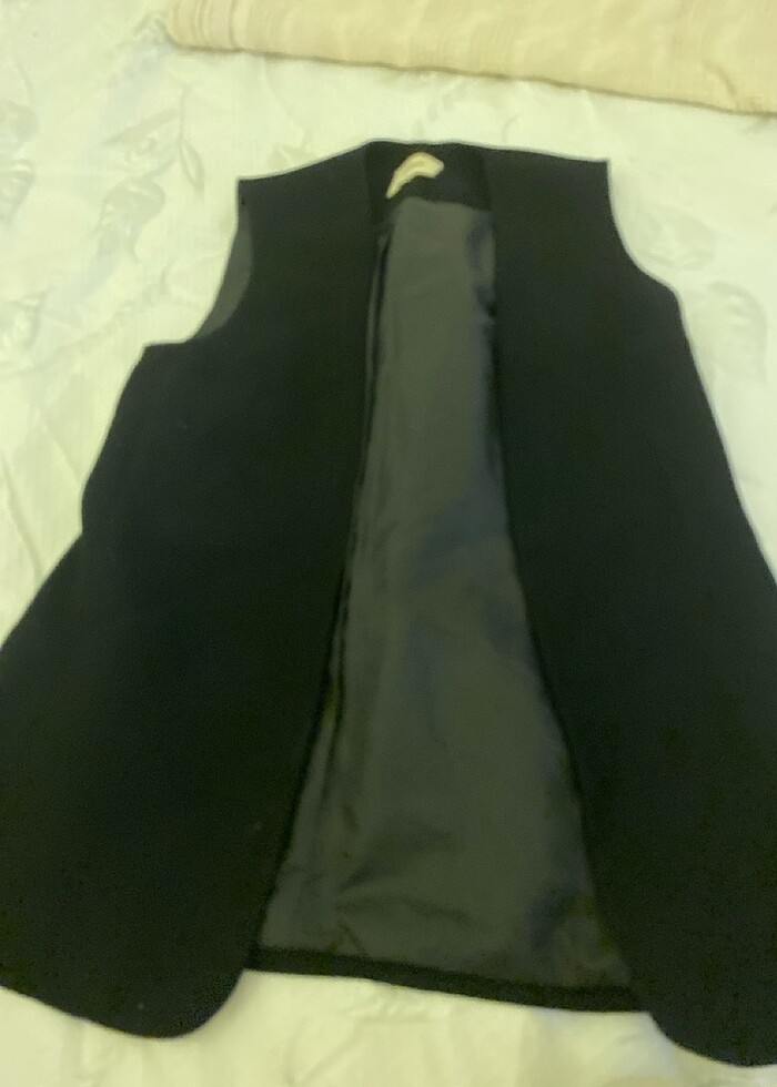 Önü açık ,38 beden siyah yelek koltuk altından yaklaşık 50 cm ,arkayı kapatıyor