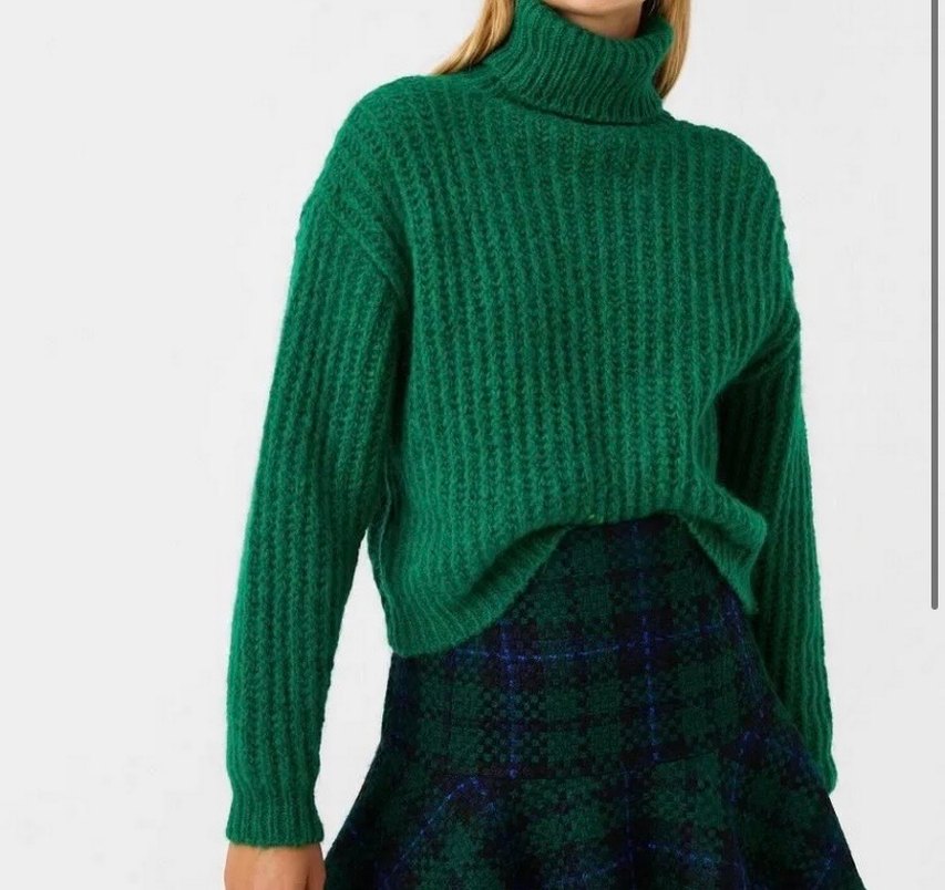 Koyu yeşil renkte, yumuşak örgü kumaştan, boğazlı ve bol kesim uzun kollu kazak. Günlük şık tarz için uygundur.