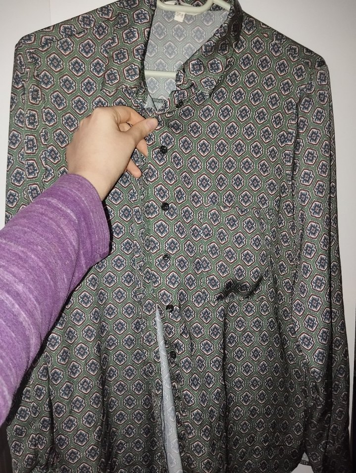 Gri renkte, yakası kesimli ve düğmeli, bol kesim uzun kollu kadın gömlek. Bohem tarzıyla gündelik kullanıma uygun midi boyda bir parça.