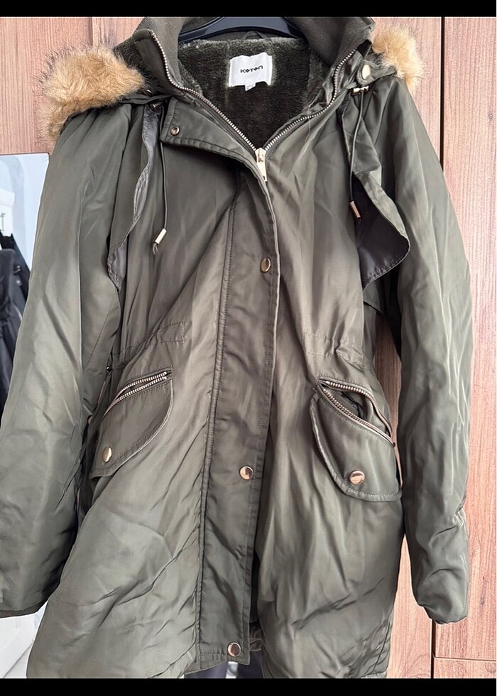Birkaç kez giyildi, hiçbir yerinde bir sıkıntısı yok. Yeni gibi. Şapkasındaki peluş çıkarılabiliyor. #koton #yeşil #parka