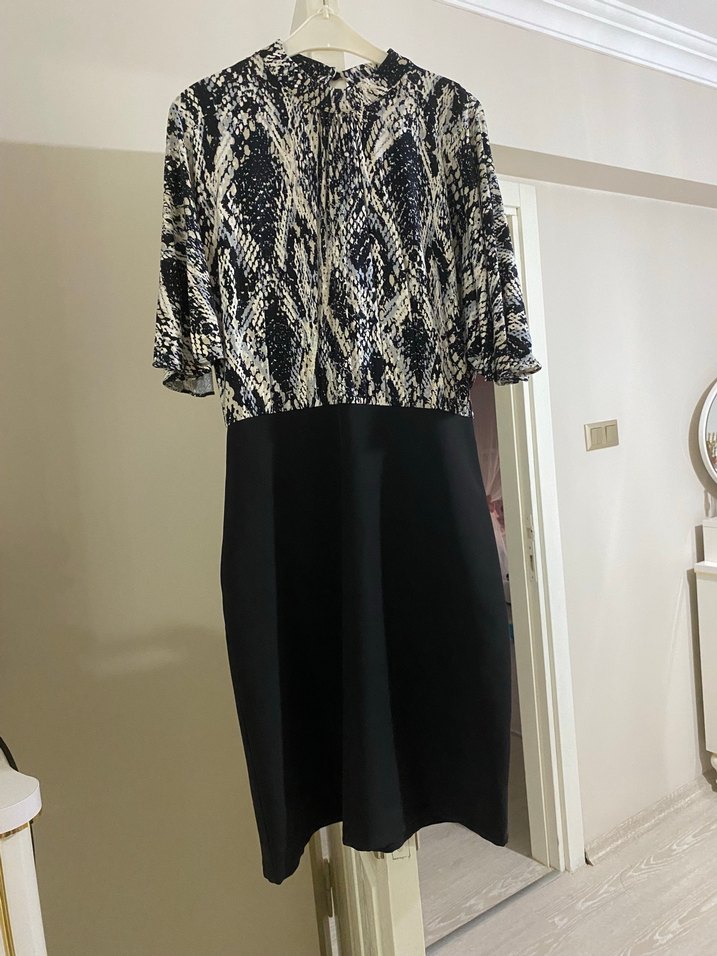1kere davette giyildi Yılan desenli pileli üst kısmı ve siyah etek kısmıyla, yüksek yakalı kısa kollu, vücuda oturan midi elbise, ofis için uygundur.