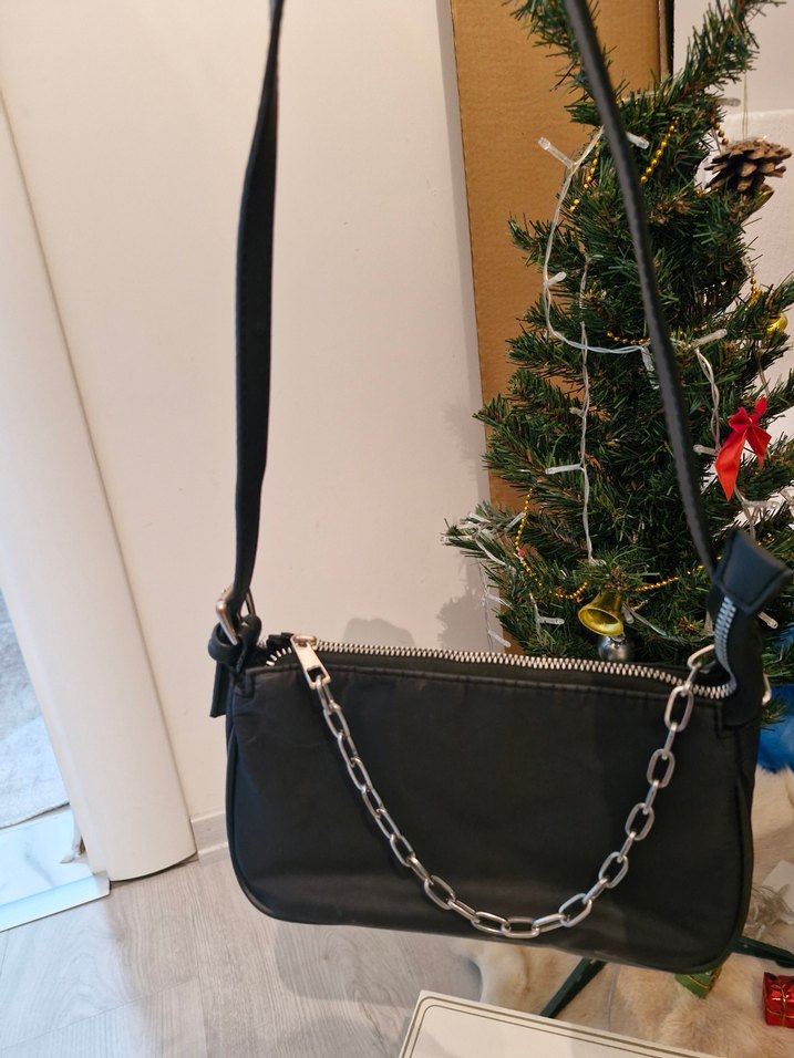 Siyah renkli, zincir detaylı kadın çantası. Sentetik kumaş.Zincir kısmında ufak deformasyon mevcut.