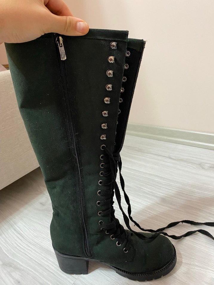 Koyu yeşil süet dizüstü bağcıklı çizme, yan fermuar ve ince topuklu. Denenmek için giyildi kusuru yoktur