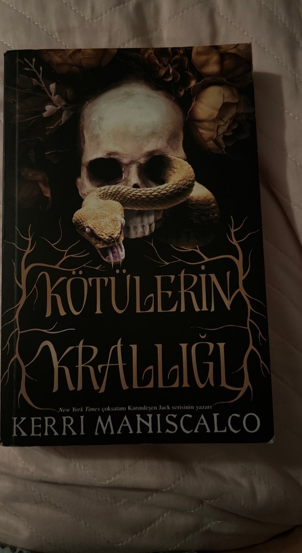 Kerri Maniscalco'nun 'Kötülerin Krallığı' adlı romanı, kafatası ve yılan figürlü karanlık bir kapak tasarımına sahip. İyi durumda