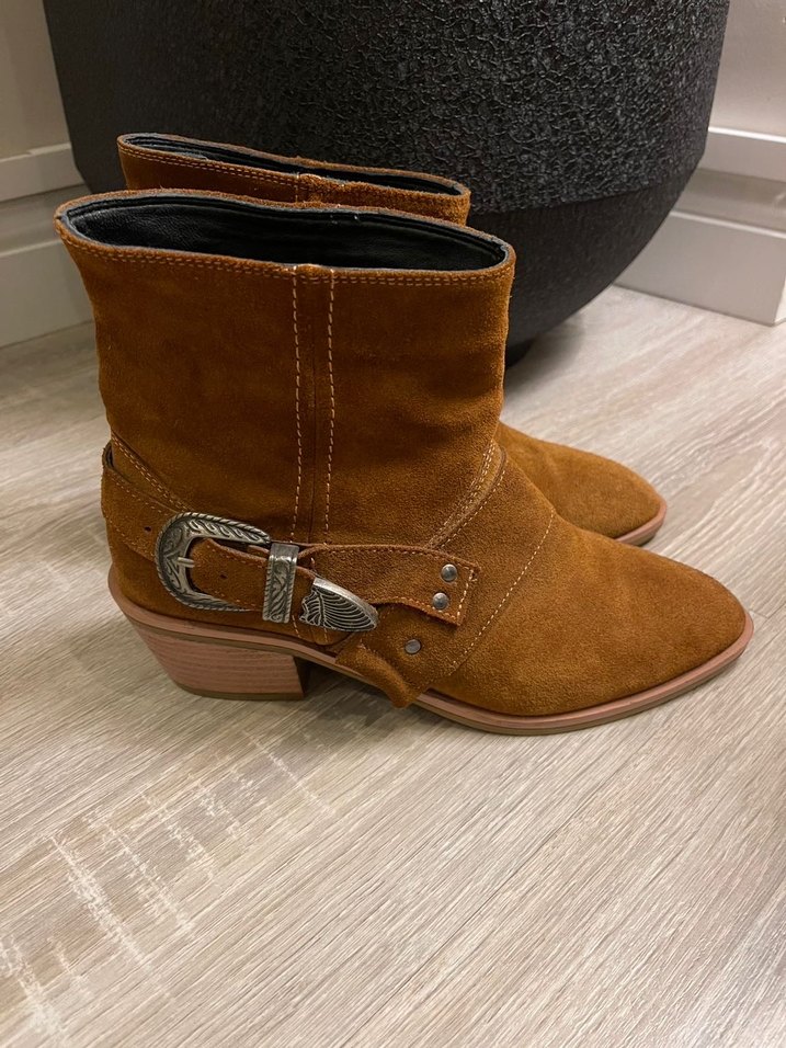 Gerçek süet deri. Topuğu 5 cm günlük kullanıma uygundur. Hiç kullanılmadı. Son fotoda görülen tokası kırılmıştı yapıştırıldı bu sebepte fiyatı uygun tutuyorum. Tekrar düşerse de kullanıma engel değil. Marka temsilidir.