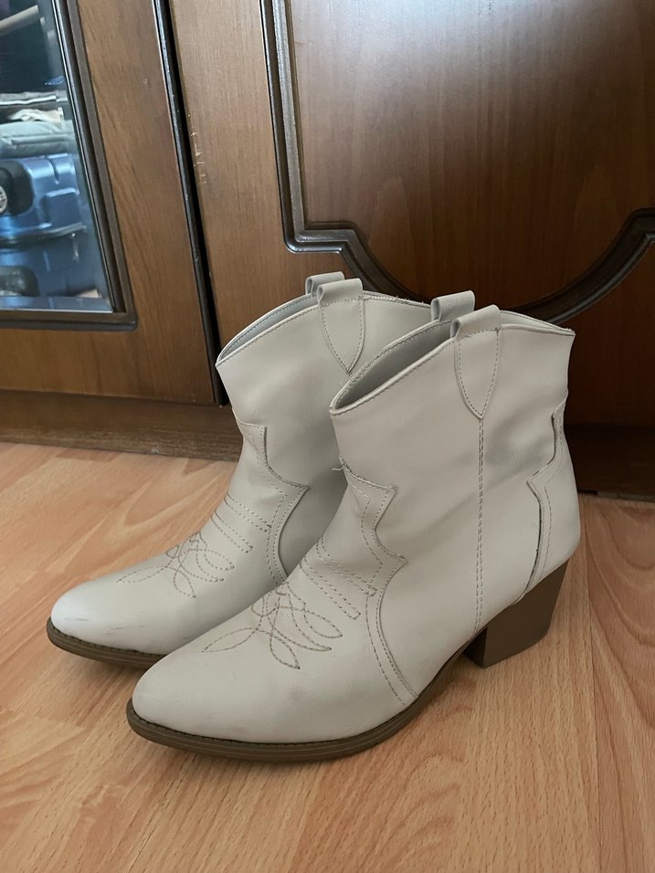 Beyaz deri, nakışlı ve tokalı kadın botları, blok topuklu, minimalist bohem tarzda, günlük kullanım için uygun.