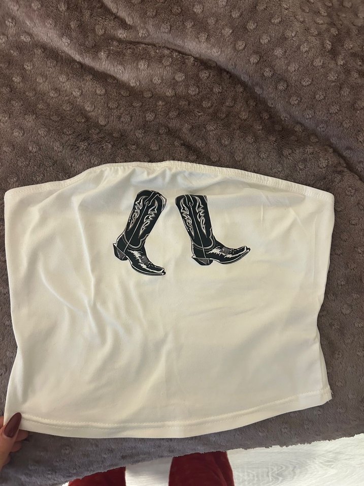 Beyaz renkli, önünde siyah baskılı botlar bulunan, rahat ve şık street wear tarzında kadın büstiyer.