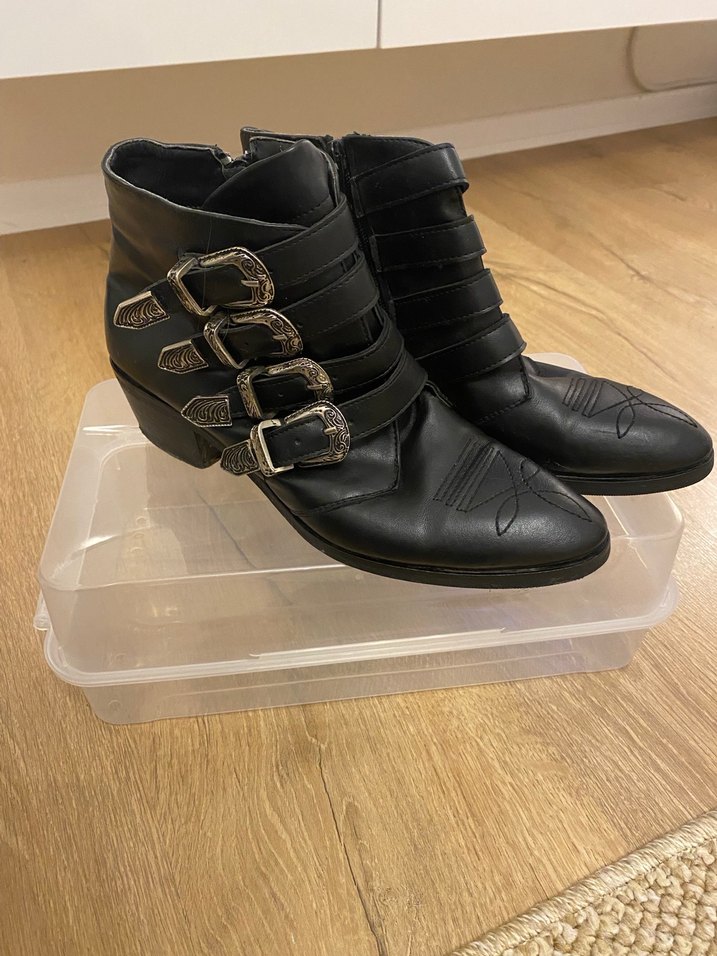 Siyah deri, tokalı kayışlara sahip blok topuklu gotik stilde kadın botu, günlük kullanım için uygundur.