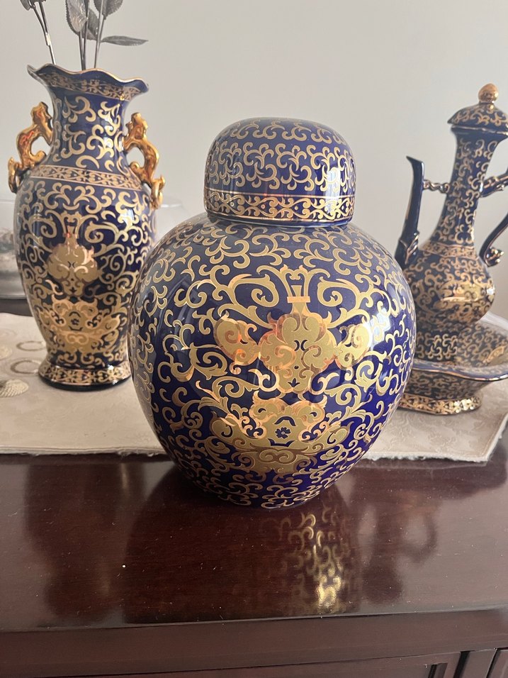 Koyu mavi zemin üzerine işlenmiş koyu altın desenlere sahip, kapağı olan yuvarlak formda dekoratif vazo. Güral porselen 7li set