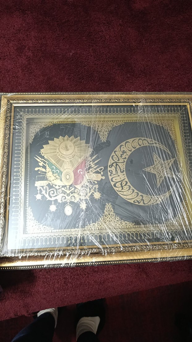 Bu koyu altın tablo, hilal, yıldız ve Osmanlı arma gibi detaylı semboller ve süslü çerçeve desenleri içerir. ️ bismillah yazısı olanın camında çok az bir çizik var iki tabloda yeni adet fiyatı 500 tl hediyelik olabilir