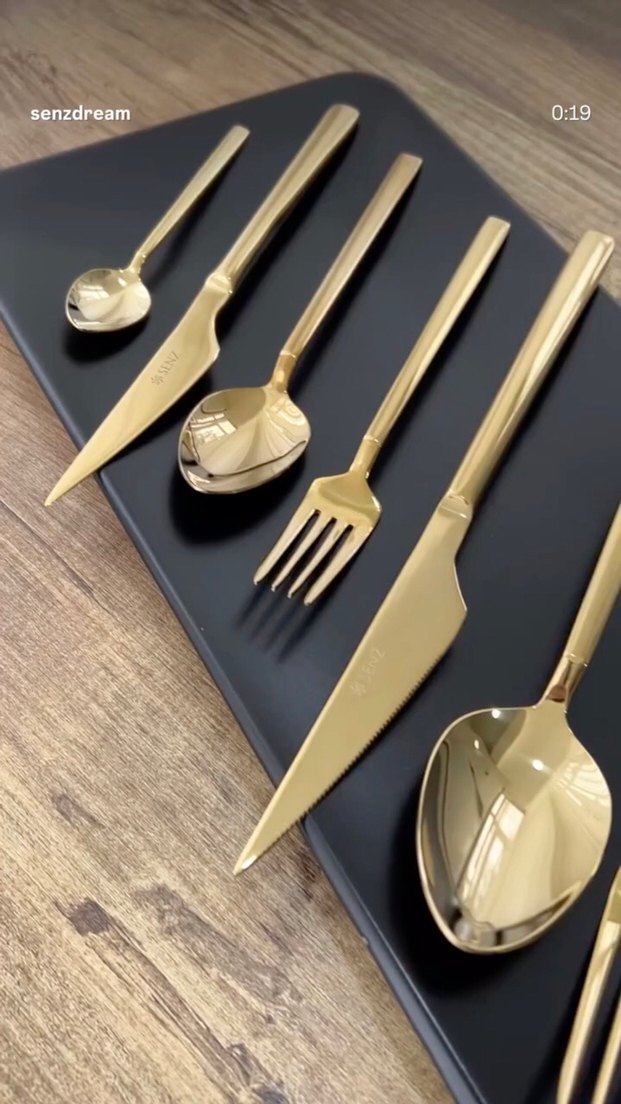 Koyu altın renkli, modern tasarımlı 84 parçadan oluşan çatal, kaşık ve bıçak seti.