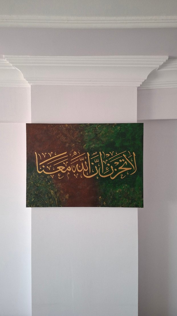 Koyu yeşil ve kahverengi tonlarda, altın renkli Arapça hat yazısı bulunan tablo, mekana klasik bir hava katıyor. 50×70 boyutunda el emeği, sipariş alınır.