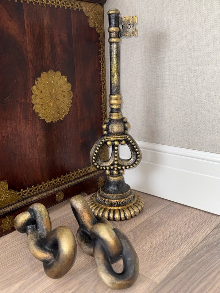 Koyu altın renginde, detaylı süslemelere sahip büyük anahtar şeklinde dekoratif biblo, zincir parçaları ile birlikte. ️