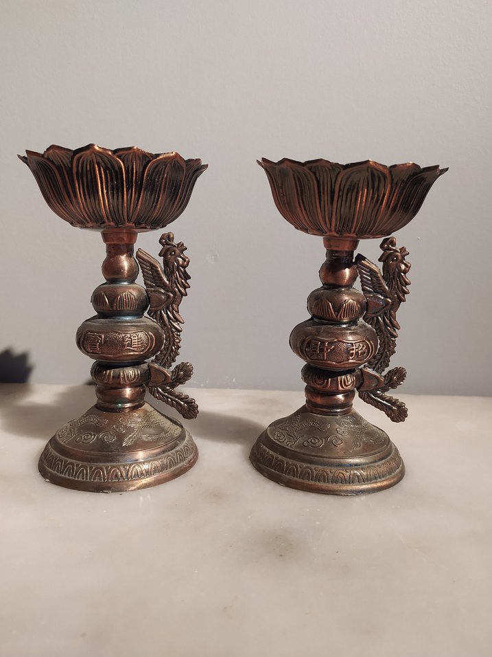 Koyu altın renkli, detaylı desenlere sahip dekoratif mumluk çifti, her ortama şıklık katar. ️