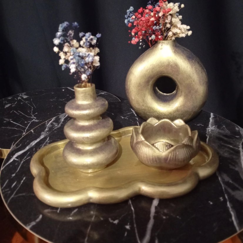 Koyu altın renkli, farklı şekillerde üç dekoratif vazo ve tepsi seti. İç mekanlara şık bir dokunuş katmak için uygundur.
