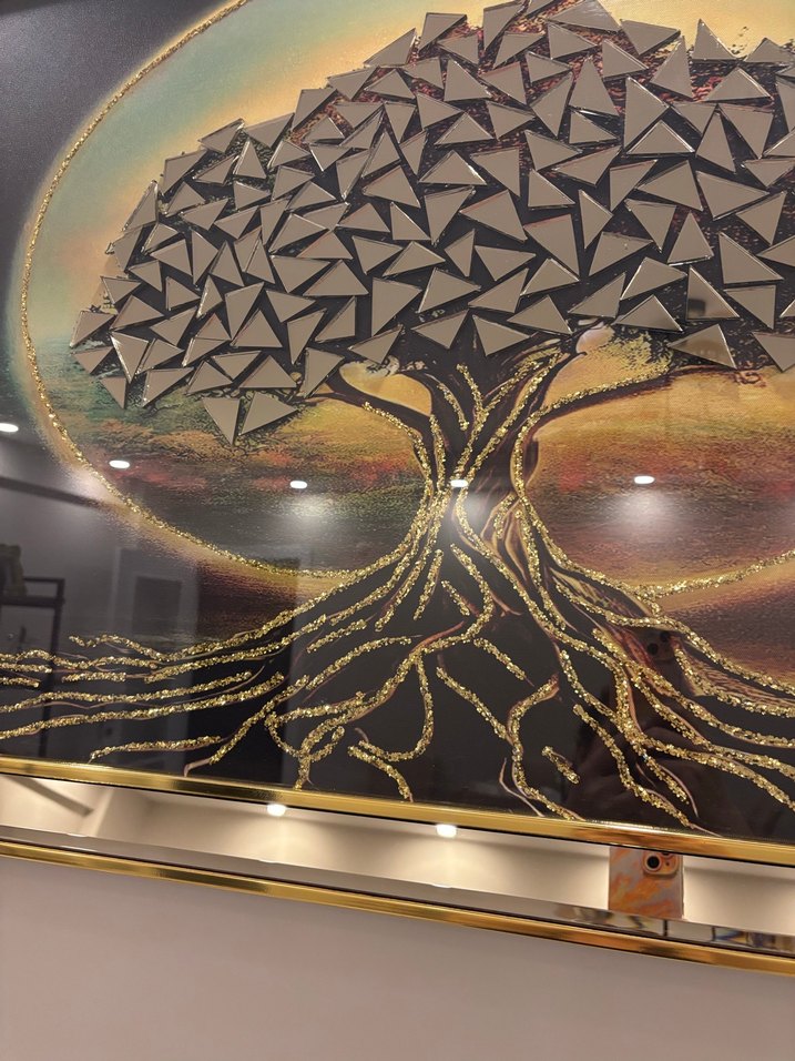 Koyu altın renginde geometrik yapraklara ve dokulu gövde ile köklere sahip ağaç resmi, modern ve sanatsal bir görünüm sunar.