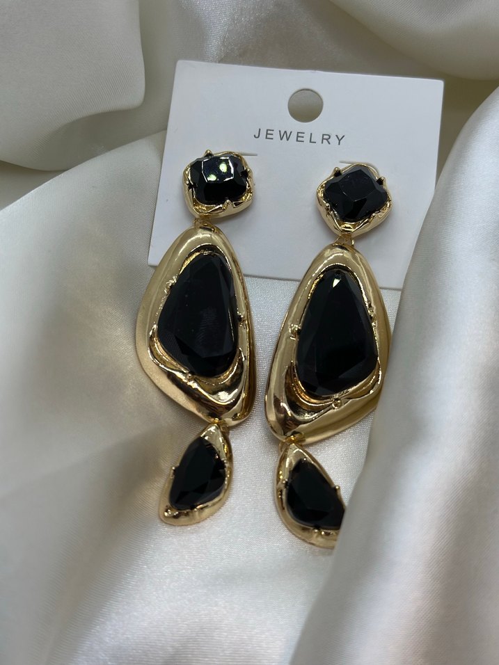 Uzun, koyu renkli desenli boncuklarla süslenmiş altın renkli küpeler, cesur ve çağdaş tarzda romantik geceler için uygun.