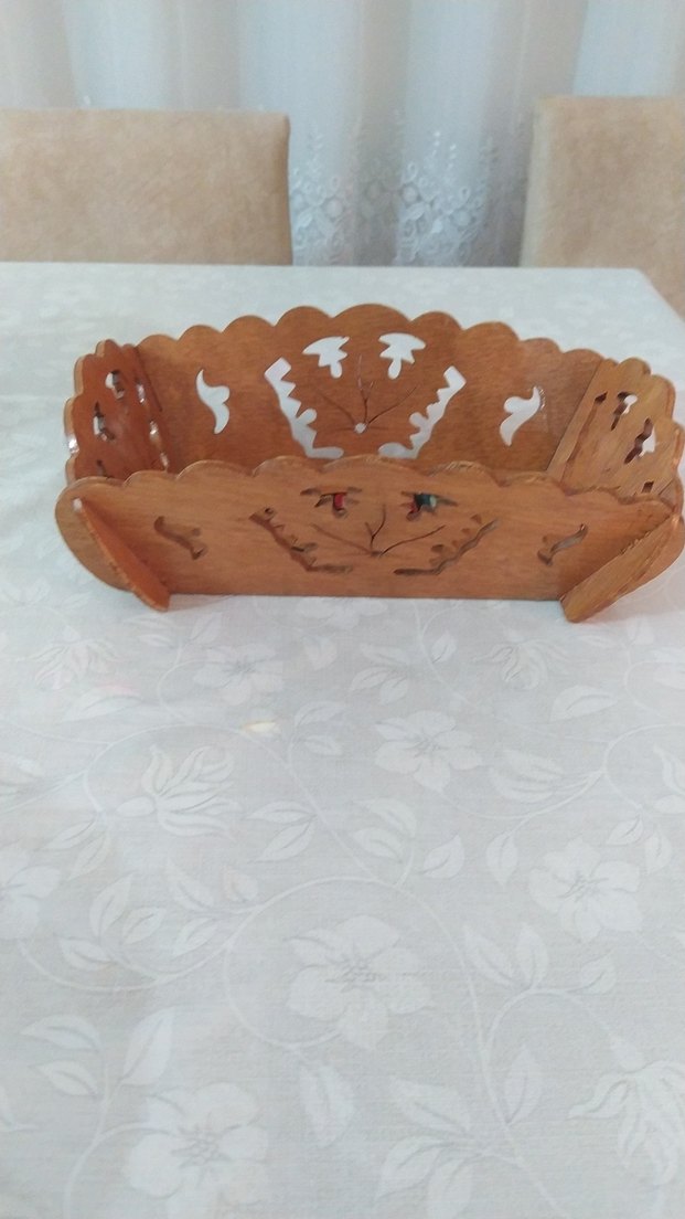Koyu bej renkte, oyma desenlere sahip ve dalgalı kenarlı ahşap çatal kaşık tutucu. el isi oyma sepet
