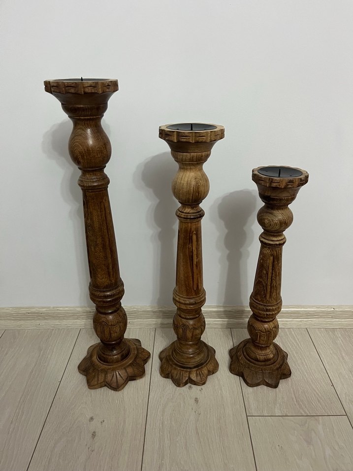 Oyma detaylı, koyu bej renkte üç farklı boyda ahşap yer şamdanı mumluk 3’lü set. Gerçek ağaç.Yer şamdanı mumluk. Vernikli. Sorunsuz. Boyutları fotoğraflarda mevcut.