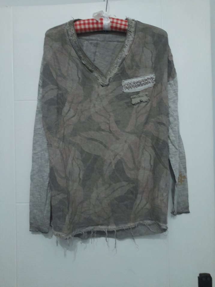 Dökümlü kumaştan, bohem tie-dye desenli, V yaka, iplikli salaş Dikim tarzı uzun kollu ve bol kesim kadın bluz. Günlük kullanıma uygundur. M/L