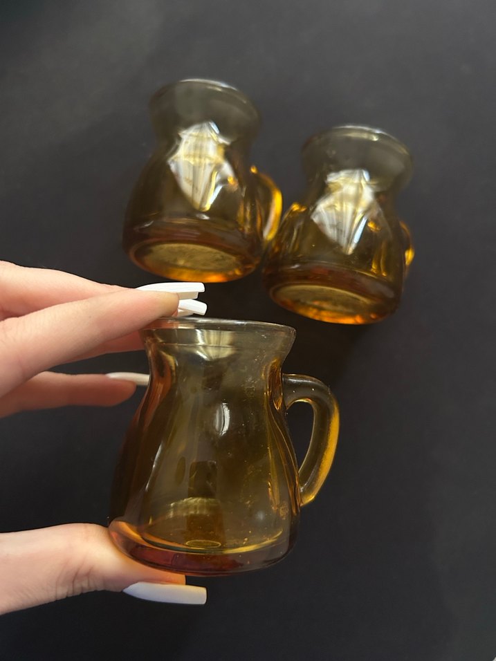 Küçük boy, kulplu koyu bej cam sürahilerden oluşan set. Pürüzsüz yüzeyli ve klasik şekilli, masanıza nostaljik bir hava katar. 3 lü fiyattır