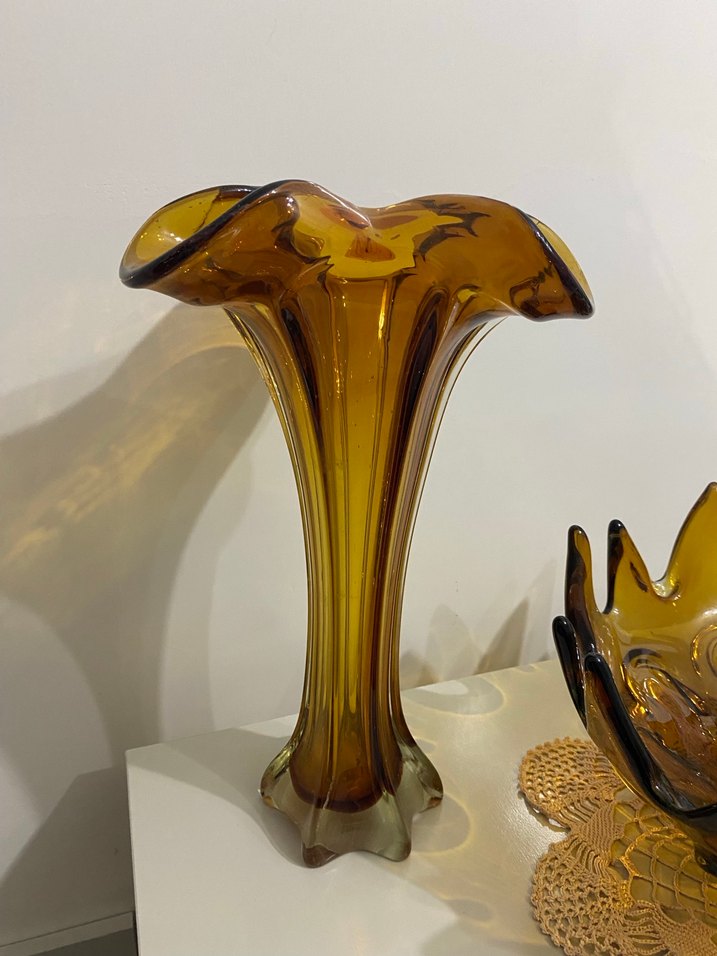 Koyu bej renkte, camdan yapılmış, akışkan ve genişleyen forma sahip vazo. Her mekana zarif bir hava katar. Murano vintage