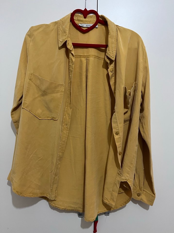 Bej renkli, keten kumaştan yapılmış, düğmeli ve uzun kollu, salaş kesim gömlek.günlük kullanıma uygun.Çok az kullandım
