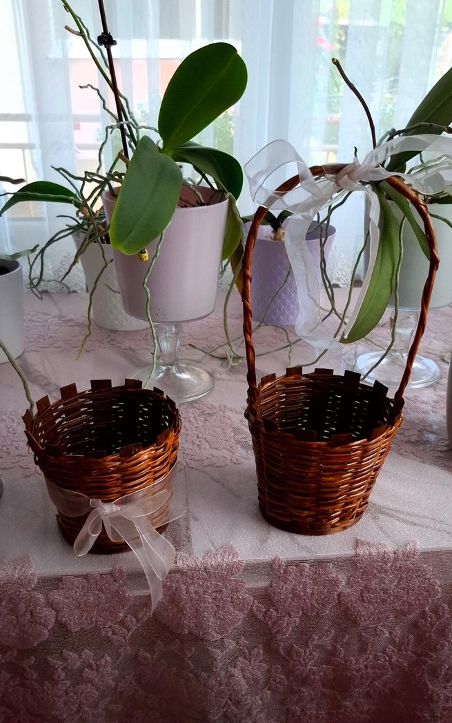 Koyu bej renkli iki adet hasır sepet seti, düzenleme veya dekorasyon için uygundur. Bir sepet hafif kurdele ile süslenmiştir.