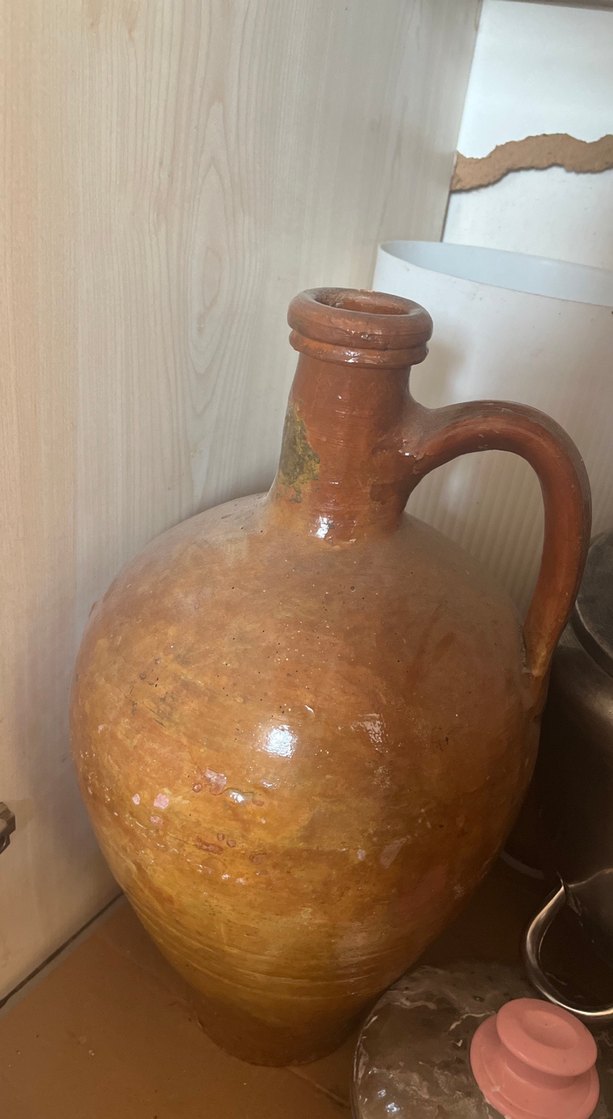 Koyu bej renkli, kulplu seramik vazo, yuvarlak gövde ve dar ağız yapısıyla rustik bir görünüm sunar.