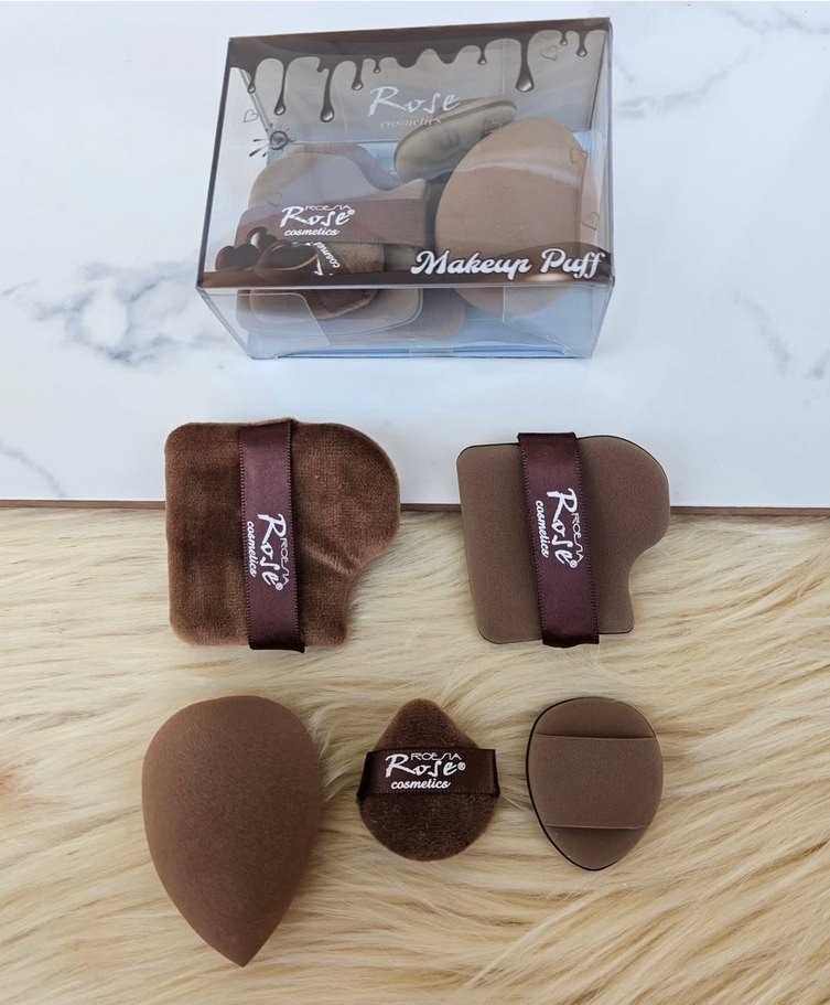 Koyu bej renkte, yumuşak dokulu ve kolay tutuş sağlayan kayışlı makyaj süngerleri ve puff seti.