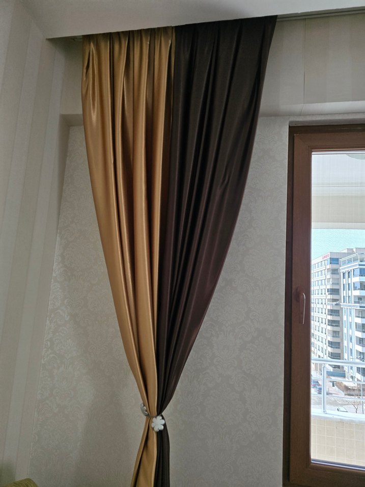 Koyu bej renkli, düz ve modern tarzda tasarlanmış perdeler, odanıza şık ve çağdaş bir hava katar.